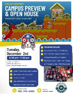 This special event is your chance to explore our award-winning Magnet programs, tour the campus, meet current students and teachers, and discover how Valley can help you Power Up! Your Future in high school and beyond.